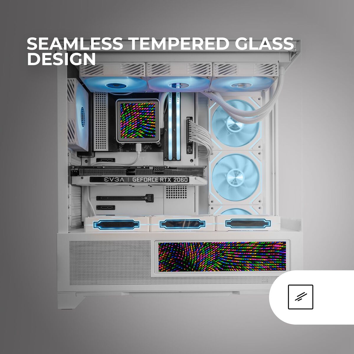 El panel inferior FULL MESH maximiza la refrigeración desde la base del equipo, optimizando el flujo interno y mejorando la eficiencia térmica de tu configuración. Un diseño pensado para reforzar la ventilación sin sacrificar la estética moderna de la caja.