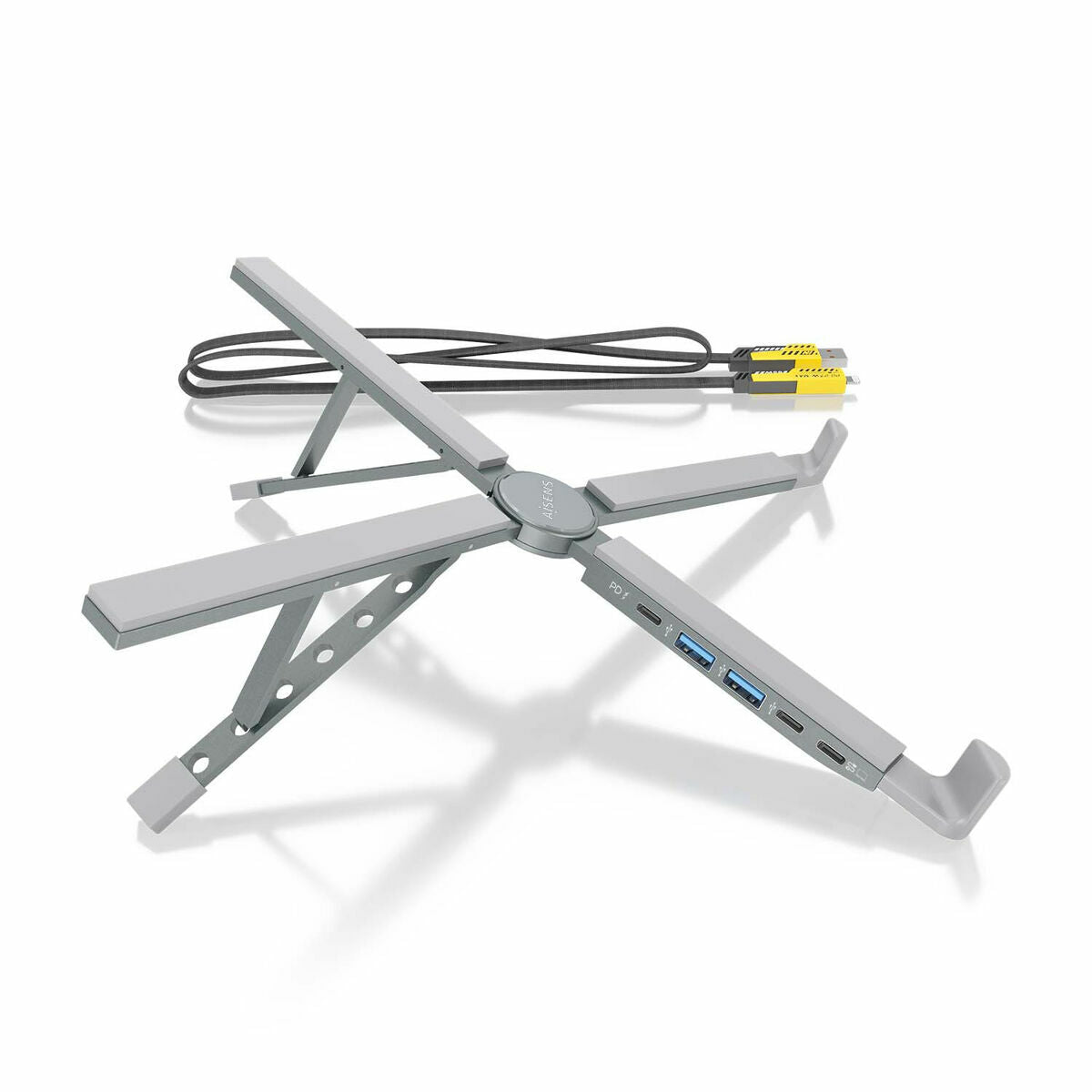 - Este soporte para portátil incluye un docking USB-C 4 en 1, con 2 puertos USB-A 2.0, 1 puerto USB-C 2.0 y 1 puerto USB-C PD de 100W para carga rápida del portátil. Facilita la conexión de dispositivos como teclados, ratones y pendrives, mientras mejora la refrigeración al elevar el portátil.
