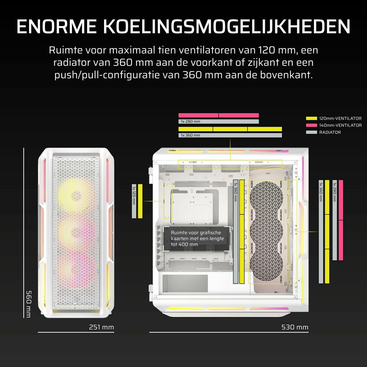 Corsair iCUE LINK 5000T LX RGB. Factor de forma: Midi Tower, Tipo: PC, Color del producto: Blanco. Factores de forma de la fuente de alimentación compatibles: ATX. Ventiladores frontales instalados: 3x 120 mm, Diámetro de ventiladores frontales soportados: 120,140 mm, Diámetro de ventiladores secundarios soportados: 120 mm. Tamaños de disco duro soportados: 3.5", Factor de forma de disco SSD: 2.5". Ancho: 255 mm, Profundidad: 545 mm, Altura: 550 mm