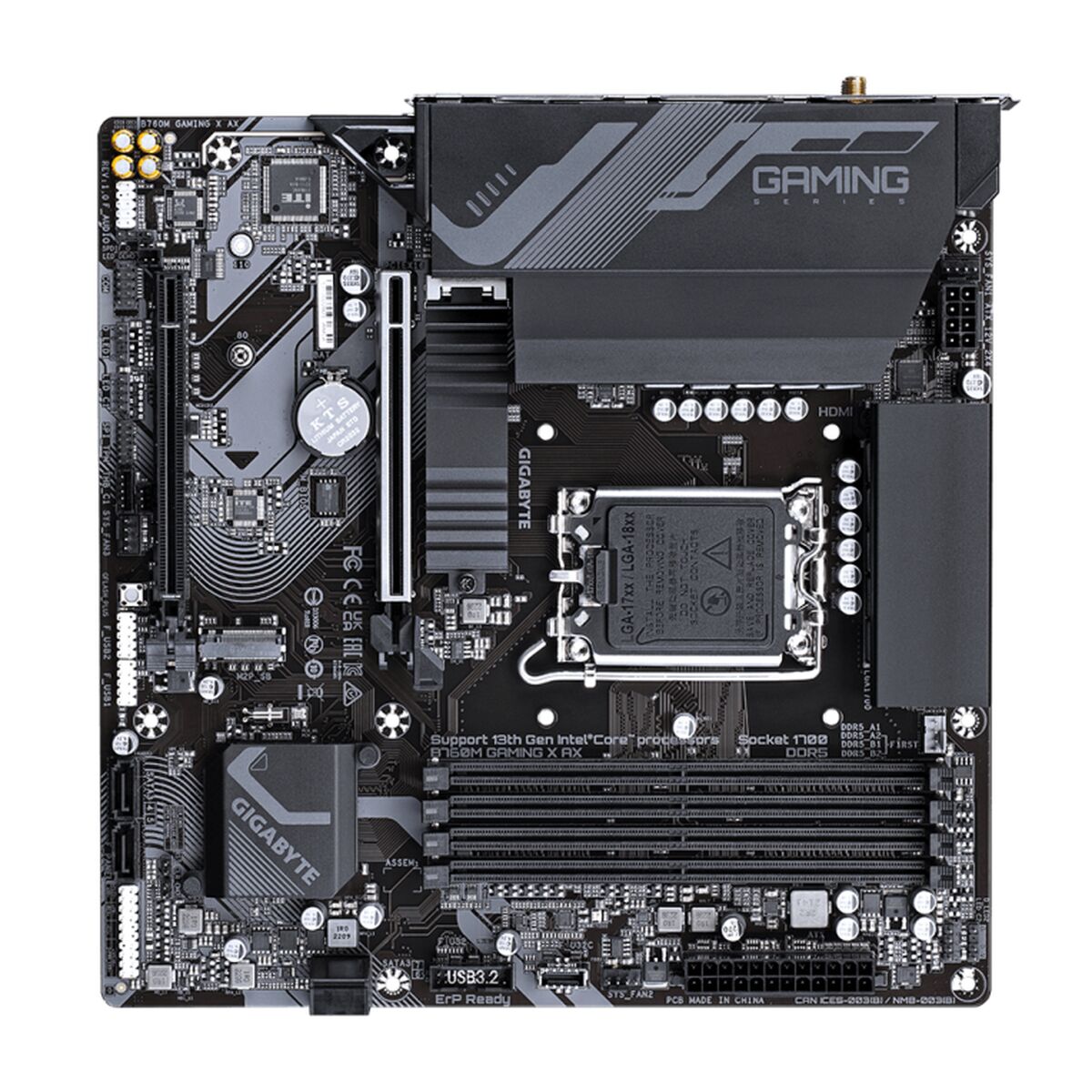 Gigabyte B760M Gaming X AX. Fabricante de procesador: Intel, Socket de procesador: LGA 1700, Procesador compatible: Intel® Celeron®, Intel® Pentium® Gold. tipos de memoria compatibles: DDR5-SDRAM, Memoria interna máxima: 128 GB, Tipo de ranuras de memoria: DIMM. Interfaces de disco de almacenamiento soportados: M.2, SATA III, Niveles RAID: 0, 1, 5, 10. Tipo de interfaz ethernet: 2.5 Gigabit Ethernet, Estándar Wi-Fi: Wi-Fi 6E (802.11ax), Wi-Fi estándares: 802.11a, 802.11b, 802.11g, Wi-Fi 4 (802.11n), Wi-Fi 5 (802.11ac), Wi-Fi 6 (802.11ax), Wi-Fi 6E.... Componente para: PC, Factor de forma: micro ATX, Familia del chipset: Intel