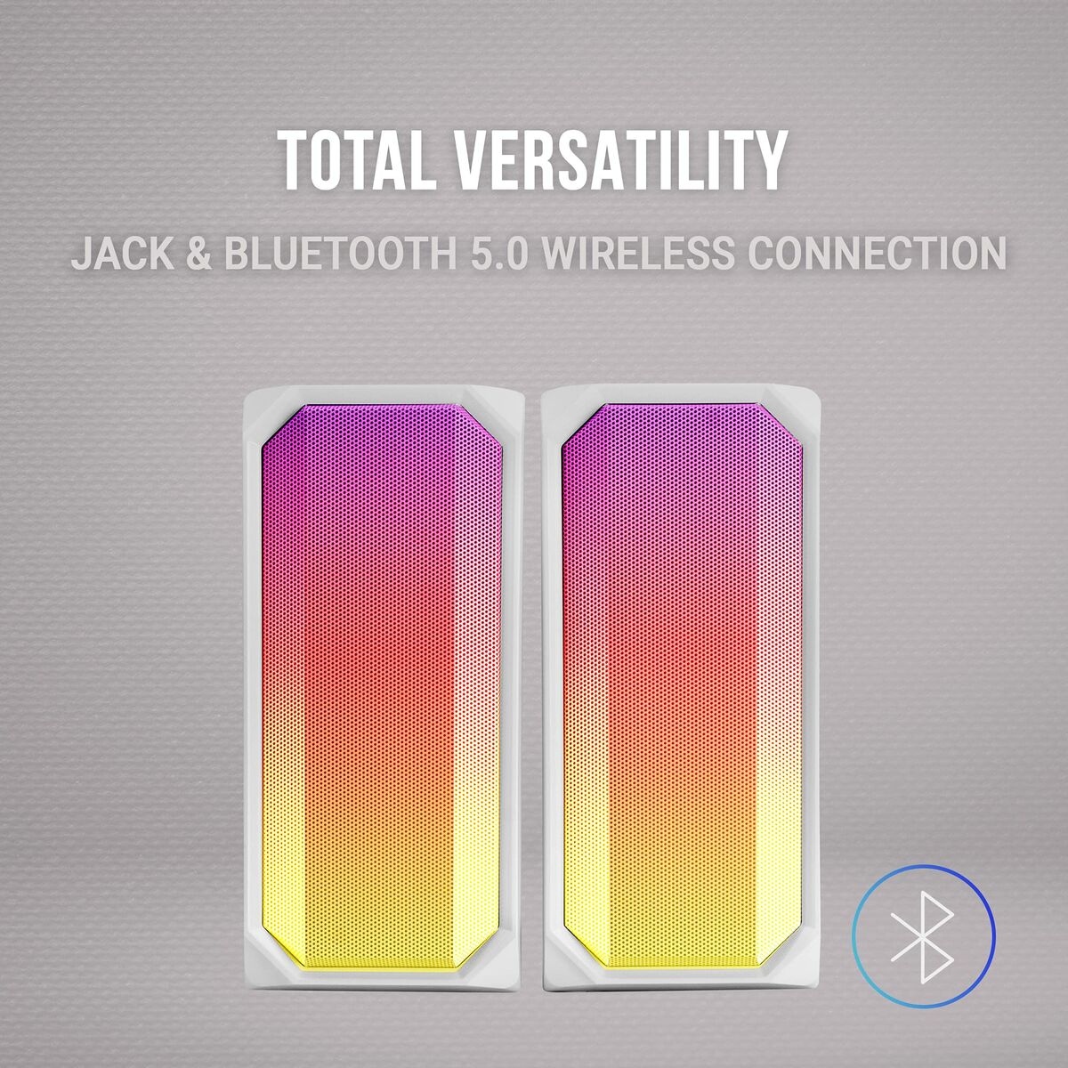 Espectacularidad máxima con el sistema RGB FULL MESH, avanzado procesador de sonido DSP con espacialidad multi-nivel y graves mejorados, conectividad total jack + Bluetooth 5.0 y una cómoda caja de control.