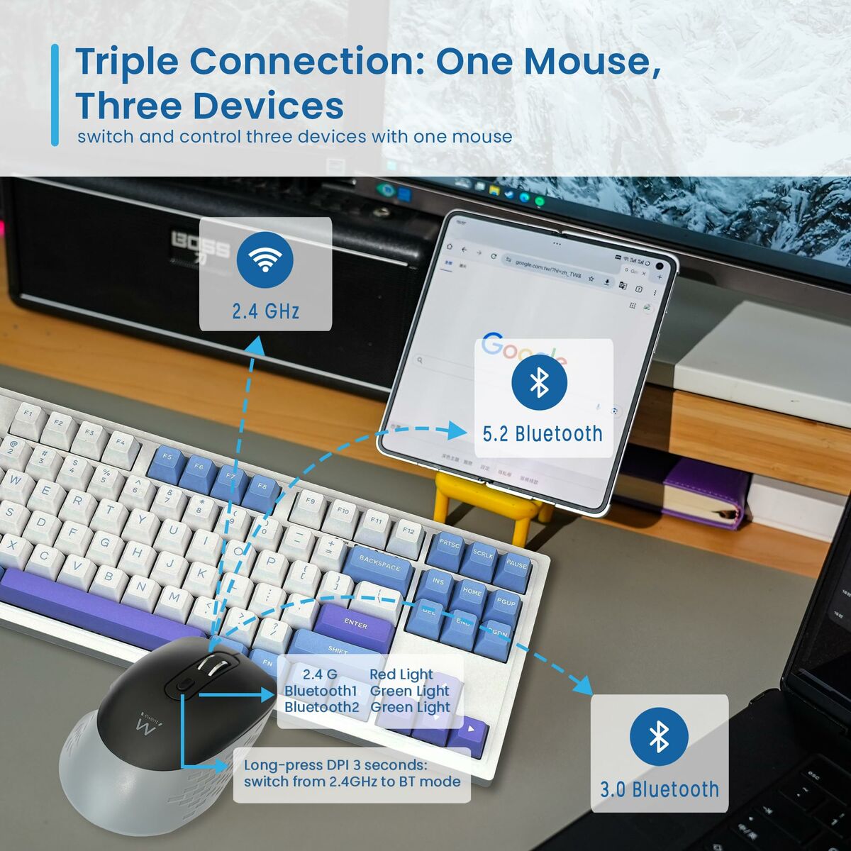 Este innovador ratón destaca por sus múltiples opciones de conectividad, soportando conexiones Bluetooth 3.0 y Bluetooth 5.2 y 2.4GHz. Esto no solo le brinda flexibilidad para elegir su conexión preferida, sino que también garantiza un rendimiento confiable en una variedad de dispositivos y escenarios.