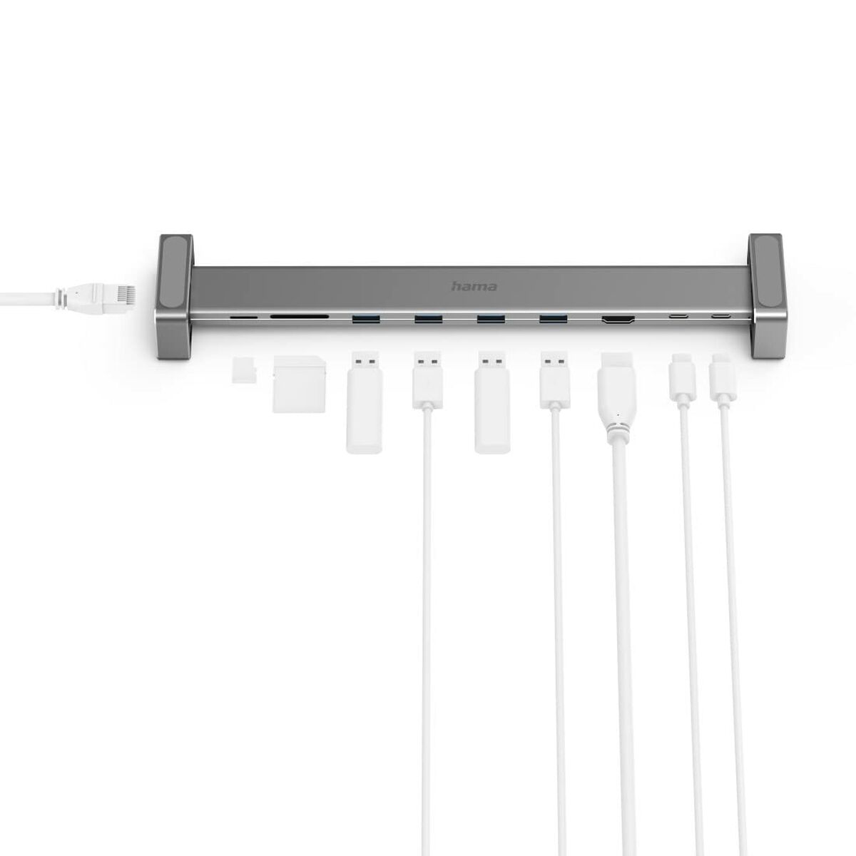 Hama 00200103. Interfaz de host: USB 3.2 Gen 1 (3.1 Gen 1) Type-C, Entrega de energía USB (USB Power Delivery) de hasta: 60 W. Ethernet LAN, velocidad de transferencia de datos: 10,100,1000 Mbit/s. Color del producto: Gris, Tarjetas de memoria compatibles: MicroSD (TransFlash), MicroSDHC, MicroSDXC, SD, SDHC, SDXC, Tipo HD: 4K Ultra HD. Tipo de fuente de alimentación: USB. Sistema operativo Windows soportado: Windows 10, Windows 7, Windows 8, Sistema operativo MAC soportado: Mac OS X 10.10 Yosemite, Mac OS X 10.11 El Capitan, Mac OS X 10.12 Sierra, Mac OS X 10.13 High...
