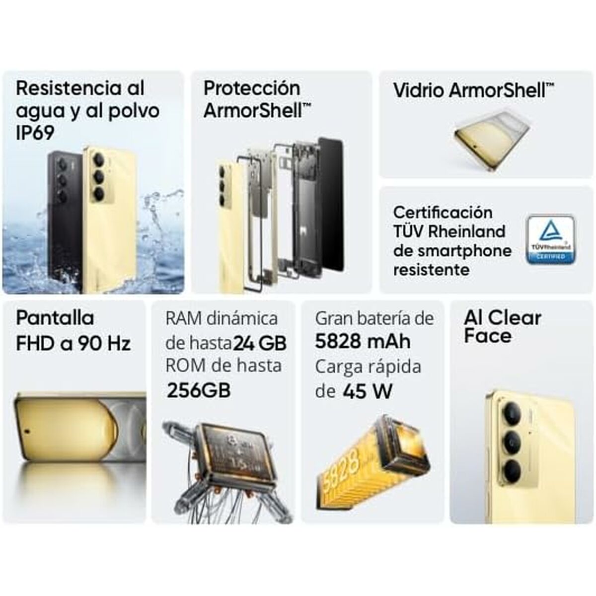 realme C75. Diagonal de la pantalla: 17,1 cm (6.72"), Resolución de la pantalla: 2400 x 1080 Pixeles. Familia de procesador: MediaTek, Modelo del procesador: Helio G92 Max. Capacidad de RAM: 8 GB, Capacidad de almacenamiento interno: 128 GB. Resolución de la cámara trasera (numérica): 50 MP, Tipo de cámara trasera: Cámara única. Capacidad de la tarjeta SIM: SIM doble. Sistema operativo instalado: Android 14. Capacidad de batería: 5828 mAh. Color del producto: Oro. Peso: 196 g